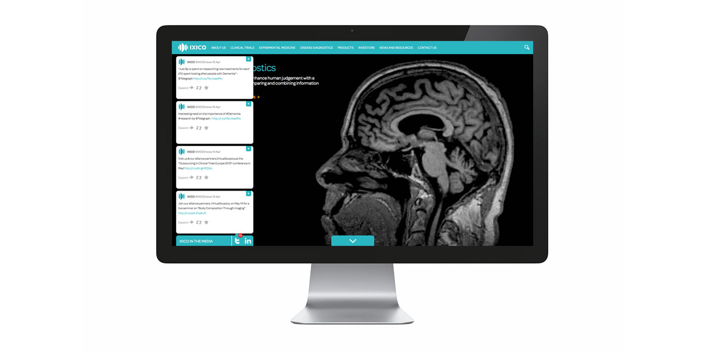 A concise brand articulation workshop helped IXICO define and express their corporate brand. KISS then designed and developed a fully responsive website which features a powerful CMS, a unique social media feed and as part of the AIM listing the site has been integrated with London Stock Exchange API to show up to date stock news and share prices. In tandem with the corporate brand work, KISS began work on the new dementia diagnosis product. This included creating a name, logo and brand identity, sales collateral and a web site which launched early in December 2013.